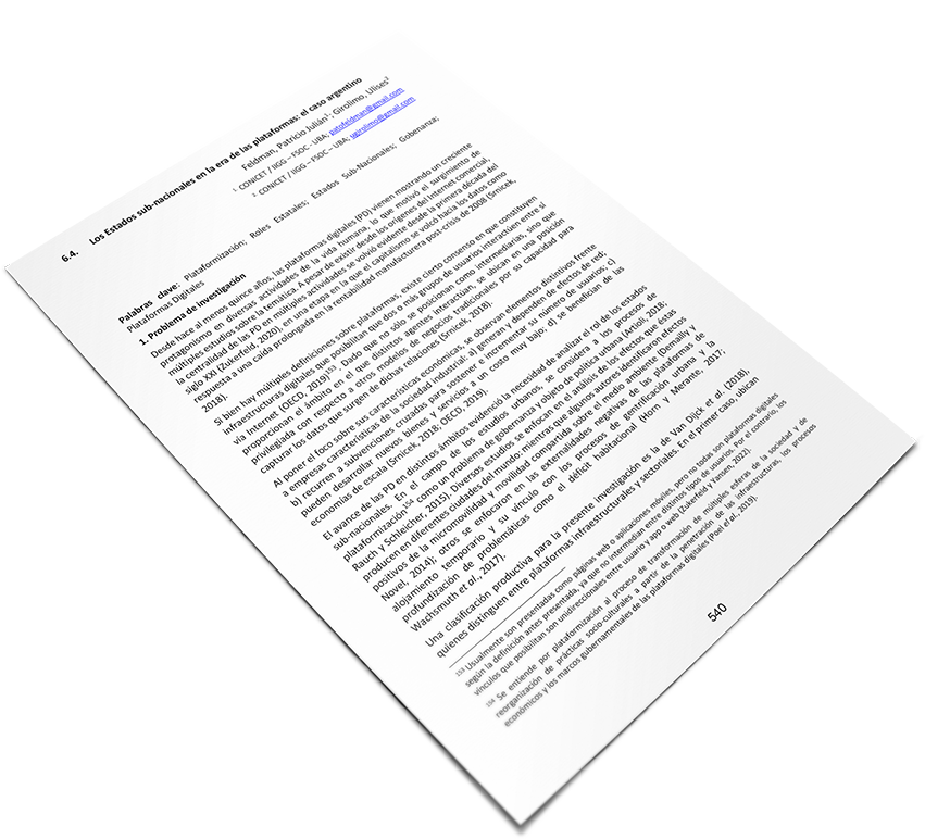 “Los Estados sub-nacionales en la era de las plataformas: el caso argentino”. 2° Jornadas CEUR “Espacio, tecnología y acumulación: los senderos del desarrollo y sus límites”. 26 al 28 de Julio, Buenos Aires. Centro de Estudios Urbanos y Regionales.